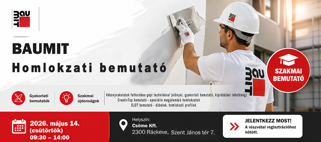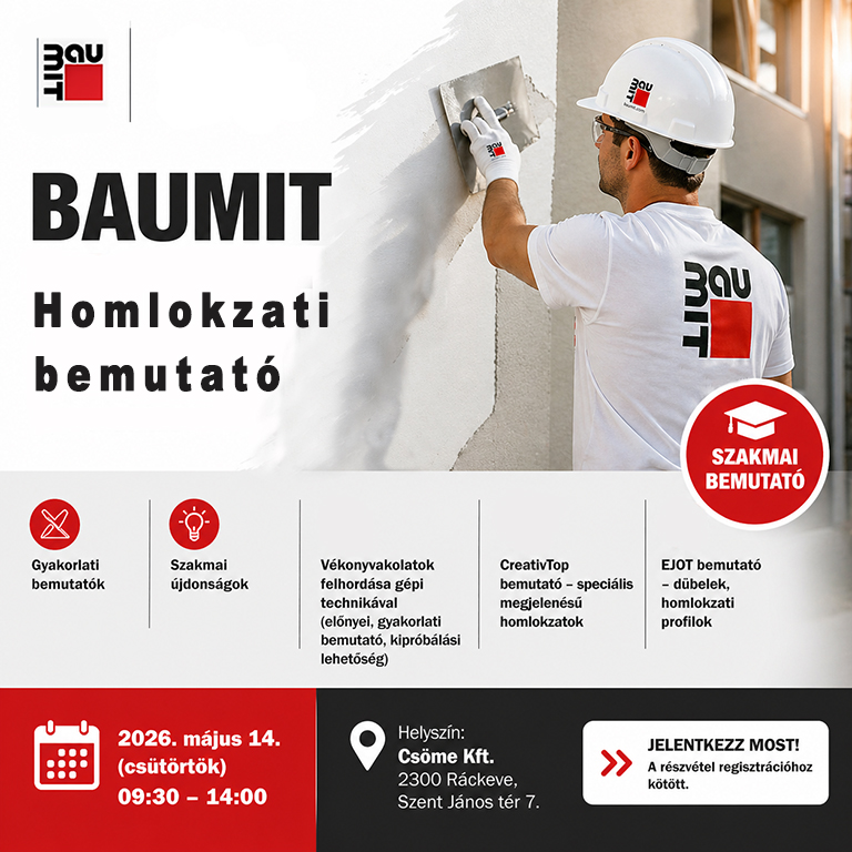 - Baumit hőszigetelés: Kiváló minőségű vékonyvakolatok és hőszigetelő rendszerek.